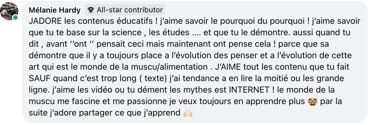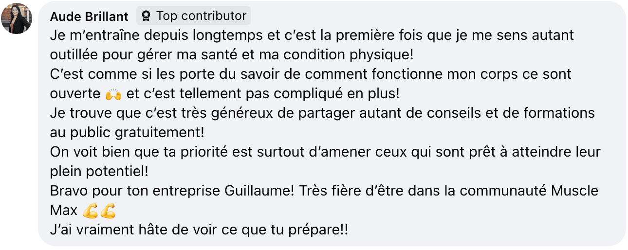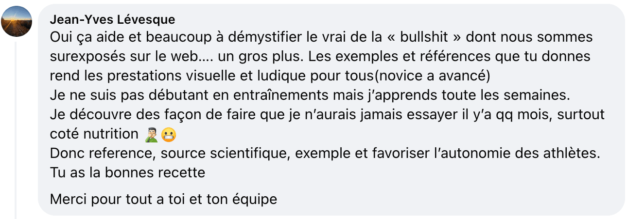 Ce n'est pas pour les débutants en entraînement, mais parfait pour ceux qui veulent amener leurs connaissances à un tout autre niveau. Les plus avancés y trouveront certainement leur compte aussi avec les modules avancés sur les méthodes, la périodisation et la programmation d'entraînement ainsi qu'avec l'accès à notre équipe de coachs experts en transformation physique.