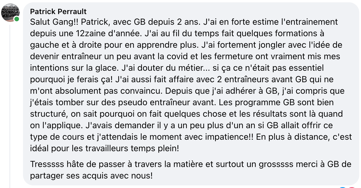 Après avoir complété cette formation et réussi l'examen, tu auras la possibilité de passer une entrevue pour devenir coach certifié GB et obtenir une formation spécifique sur le service client et nos méthodes uniques, du mentorat et support de moi et nos head coachs un accès à nos systèmes de gestion de clients, notre banque de programmes, et des stratégies d'acquisition de clients afin de très bien gagner ta vie à partir de ta passion.